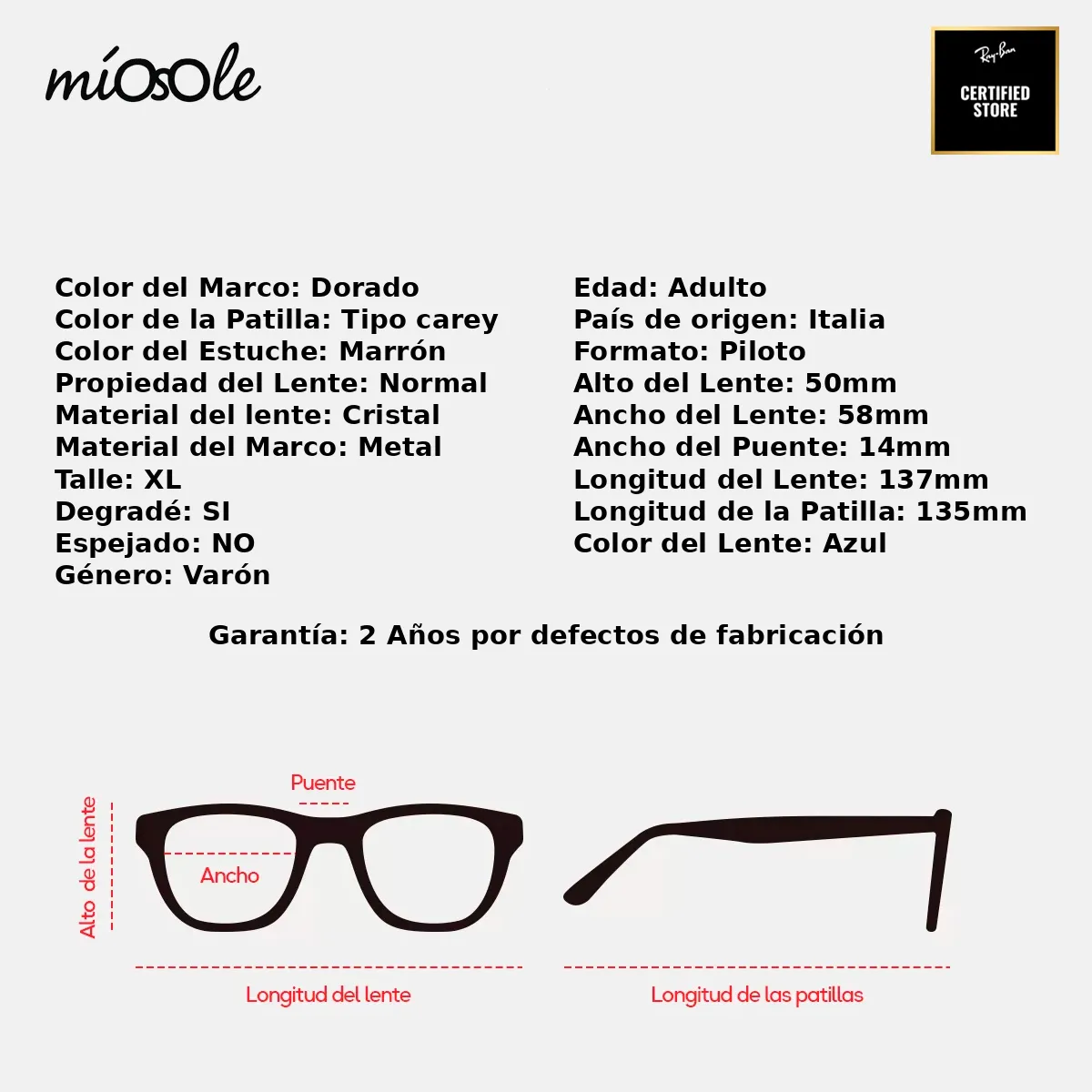 Somos Mio Sole Reseller Certificado Ray-Ban. Los lentes que comercializamos SON ORIGINALES. Incluyen sus respectivas etiquetas y marcas de originalidad. GARANTÍA DE 2 AÑOS Por defectos de Fabricación /////////// CAMBIOS Y DEVOLUCIONES ////////// IMPORTANTE: Para que los cambios y/o devoluciones sean efectuados, los productos deben estar en perfectas condiciones: Sin marcas ni rayones; No pueden estar usados o sucios, tanto los lentes como el estuche. Deben tener TODAS las etiquetas y pegatinas. De lo contrario la devolución o cambio queda sin efecto.