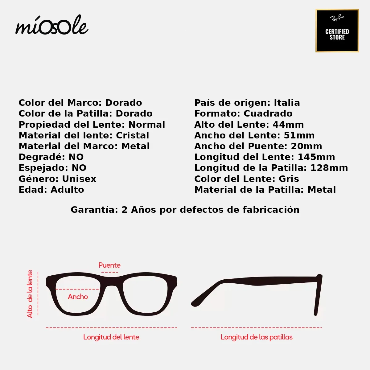 PODÉS VER TODAS LAS ESPECIFICACIONES DE ESTE MODELO EN LA ÚLTIMA IMAGEN Somos Mio Sole Reseller Certificado Ray-Ban. Los lentes que comercializamos SON ORIGINALES. Incluyen sus respectivas etiquetas y marcas de originalidad. GARANTÍA DE 2 AÑOS Por defectos de Fabricación Para que los cambios y/o devoluciones sean efectuados, los productos deben estar en perfectas condiciones: Sin marcas ni rayones; No pueden estar usados o sucios, tanto los lentes como el estuche. Deben tener TODAS las etiquetas y pegatinas. De lo contrario la devolución o cambio queda sin efecto.