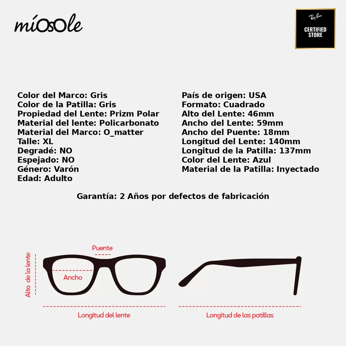 0OO9417 94171959 PODÉS VER TODAS LAS ESPECIFICACIONES DE ESTE MODELO EN LA ÚLTIMA IMAGEN Somos Mio Sole Reseller Certificado Ray-Ban. Los lentes que comercializamos SON ORIGINALES. Incluyen sus respectivas etiquetas y marcas de originalidad. GARANTÍA DE 2 AÑOS Por defectos de Fabricación Para que los cambios y/o devoluciones sean efectuados, los productos deben estar en perfectas condiciones: Sin marcas ni rayones; No pueden estar usados o sucios, tanto los lentes como el estuche. Deben tener TODAS las etiquetas y pegatinas. De lo contrario la devolución o cambio queda sin efecto.