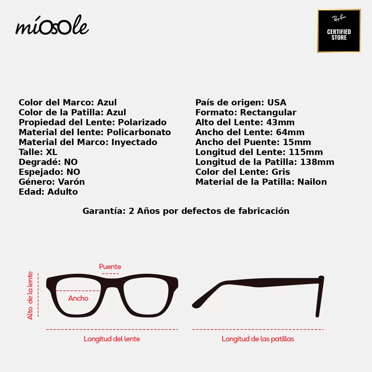 PODÉS VER TODAS LAS ESPECIFICACIONES DE ESTE MODELO EN LA ÚLTIMA IMAGEN Somos Mio Sole Reseller Certificado Ray-Ban. Los lentes que comercializamos SON ORIGINALES. Incluyen sus respectivas etiquetas y marcas de originalidad. GARANTÍA DE 2 AÑOS Por defectos de Fabricación Para que los cambios y/o devoluciones sean efectuados, los productos deben estar en perfectas condiciones: Sin marcas ni rayones; No pueden estar usados o sucios, tanto los lentes como el estuche. Deben tener TODAS las etiquetas y pegatinas. De lo contrario la devolución o cambio queda sin efecto.