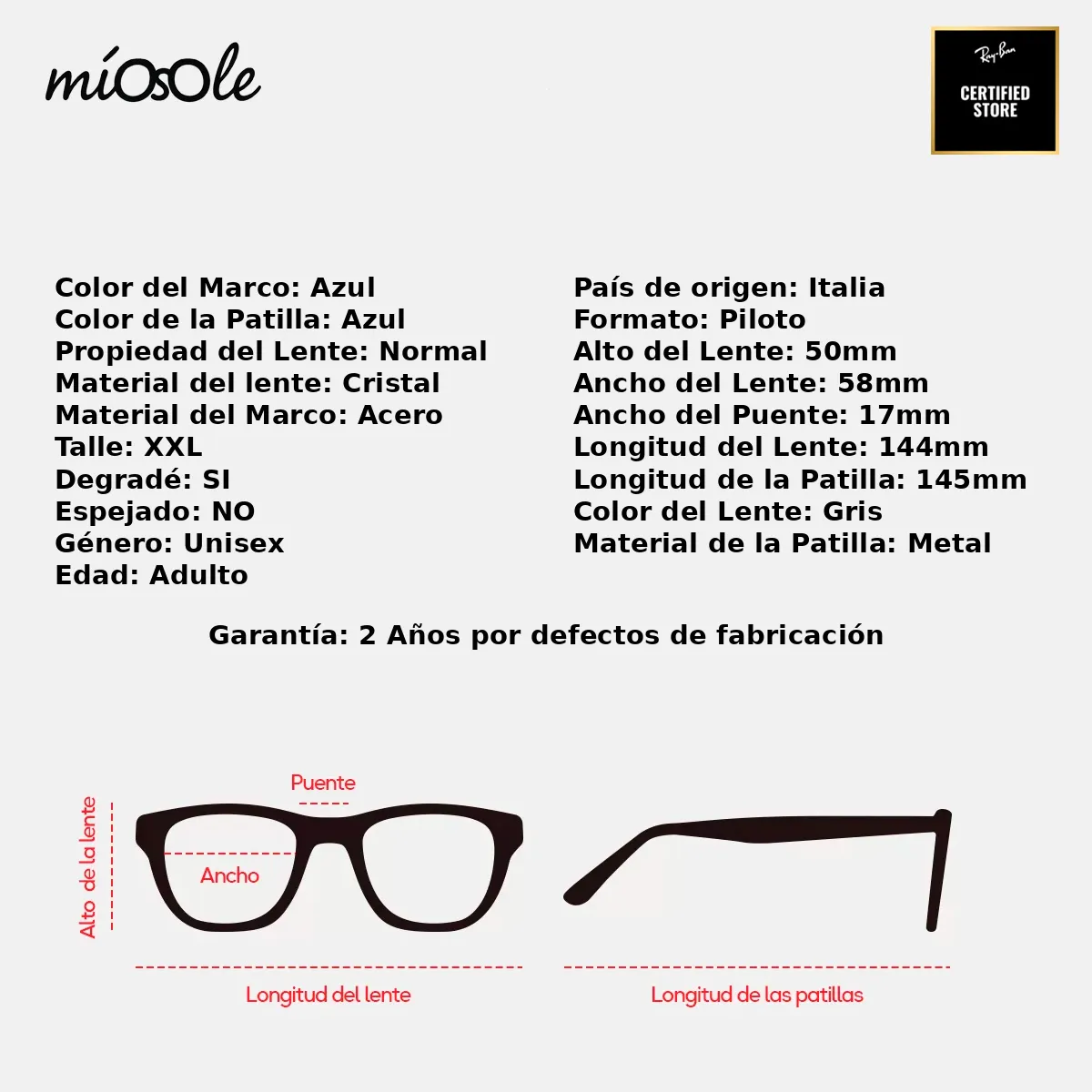 PODÉS VER TODAS LAS ESPECIFICACIONES DE ESTE MODELO EN LA ÚLTIMA IMAGEN Somos Mio Sole Reseller Certificado Ray-Ban. Los lentes que comercializamos SON ORIGINALES. Incluyen sus respectivas etiquetas y marcas de originalidad. GARANTÍA DE 2 AÑOS Por defectos de Fabricación Para que los cambios y/o devoluciones sean efectuados, los productos deben estar en perfectas condiciones: Sin marcas ni rayones; No pueden estar usados o sucios, tanto los lentes como el estuche. Deben tener TODAS las etiquetas y pegatinas. De lo contrario la devolución o cambio queda sin efecto.